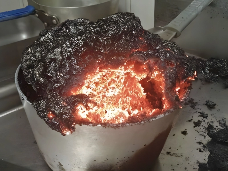 Die Person, die dieses Gericht zubereitete, gab an, dass sie Karamell herstellen wollte. Sie war abgelenkt, verlor es aus den Augen und kehrte zu dieser erschreckenden, vulkanischen Landschaft zurück, die an den Vesuv erinnert, als sie Brandgeruch roch.