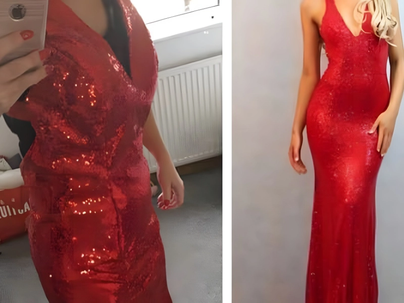 Das Bild rechts scheint alles zu versprechen – wer möchte nicht in diesem atemberaubenden Kleid zu einem Abendempfang erscheinen? Es erfüllt alle Kriterien, denn es ist glitzernd, stilvoll und rot. Eine Kundin hatte große Erwartungen, als sie Herdress ihre Maße übermittelte.