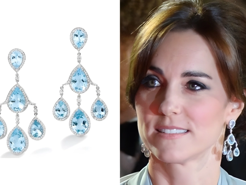Dazu kombinierte sie exquisite Kronleuchter-Ohrringe mit blauem Topas, die bei jeder Kamerabewegung funkelten. Da Carole Middleton diese mit Diamanten besetzten Weißgold-Ohrringe bereits 2011 auf der Hochzeitsfeier ihrer Tochter trug, ist es durchaus möglich, dass Kate sie sich von ihrer Mutter "ausgeliehen" hat.