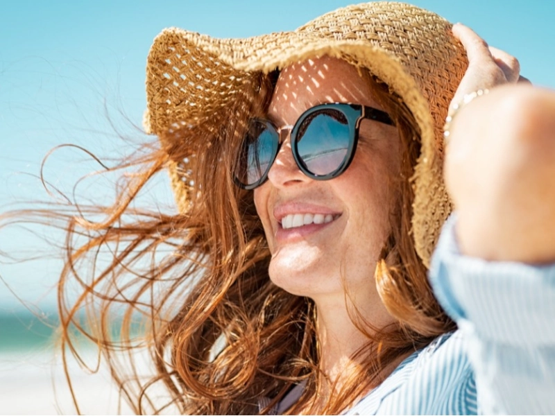 Tragen Sie täglich, auch an bewölkten Tagen, ein Breitband-Sonnenschutzmittel mit einem Lichtschutzfaktor (LSF) von mindestens 30 auf. Breitband-Sonnenschutzmittel schützen sowohl vor UVB- als auch vor UVA-Strahlen, die für Hautalterung und -schäden verantwortlich sind. Tragen Sie das Sonnenschutzmittel alle zwei Stunden erneut auf, insbesondere wenn Sie schwimmen oder viel Zeit im Freien verbringen. Vergessen Sie dabei nicht oft vernachlässigte Stellen wie Ohren, Nacken und Handrücken.