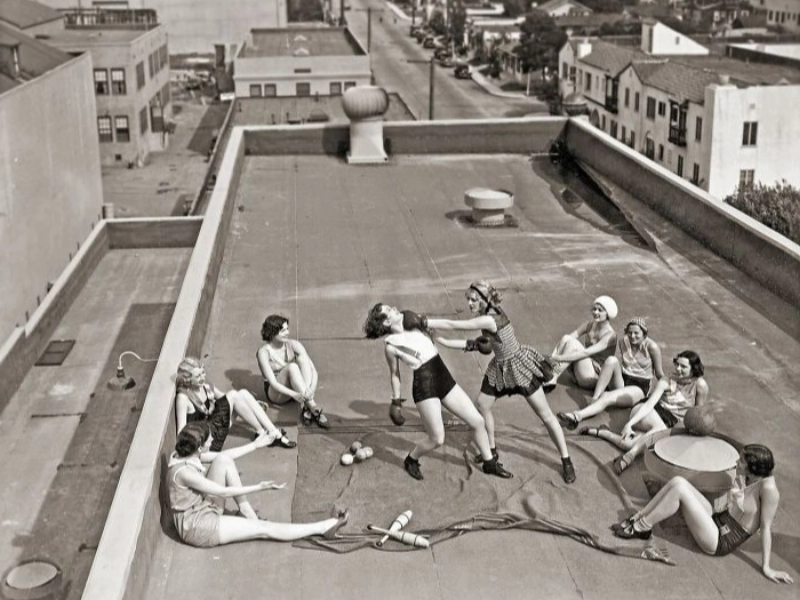 Echte weibliche Kameradschaft und Frauenboxen auf einem Dach im Jahr 1938.