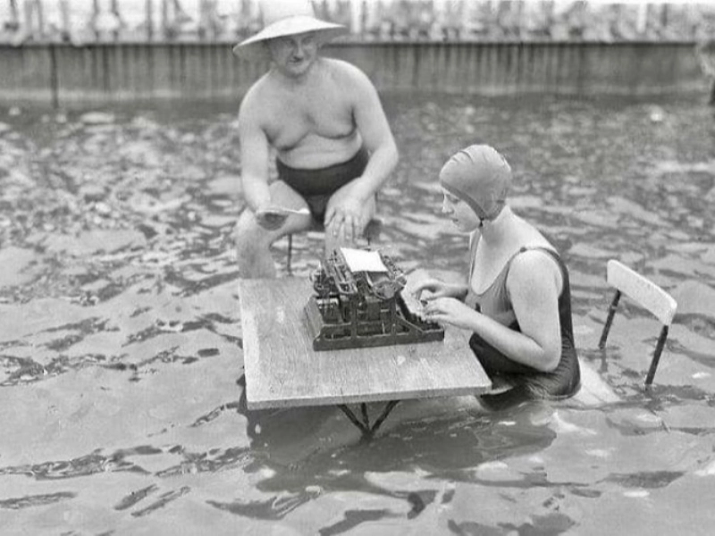 Ein Geschäftsmann und seine Sekretärin arbeiten unermüdlich weiter, während sie sich in einem Pool in Berlin abkühlen – das Jahr ist 1926.