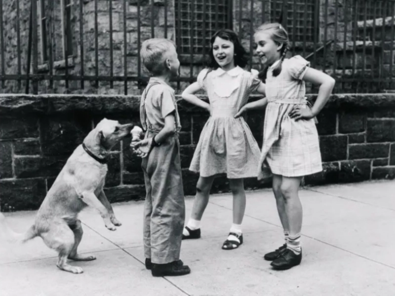 Während der Junge die Mädchen kennenlernt, bedient sich ein Hund an seinem Eis.