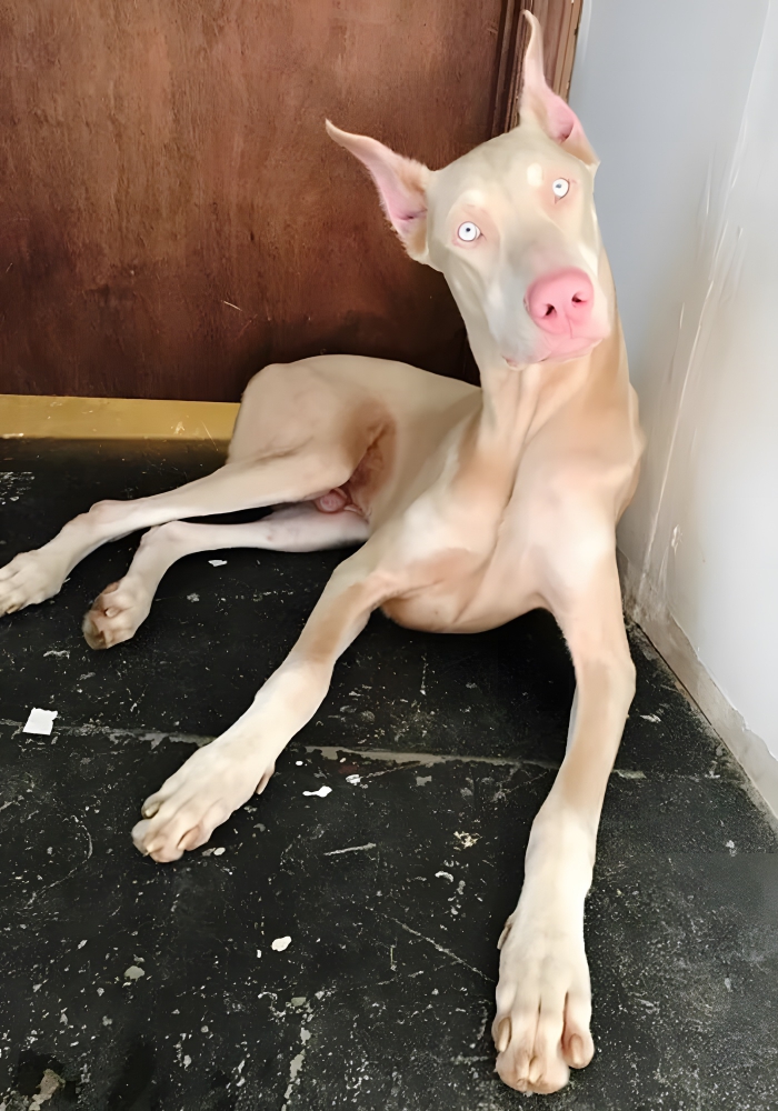 Das hier ist Spade, der unglaubliche Albino-Dobermann. Innerhalb seiner Rasse ist dieser nicht gerade kleine Welpe einzigartig mit seinem gold-cremefarbenen Fell und seinen extrem hellblauen Augen. Haben Sie jemals einen Dobermann gesehen, der völlig ohne das typische Schokoladenbraun ist? Spades ungewöhnliche Farbe lässt ihn großartig aussehen und würde ihm einen Job als erfolgreiches Haustiermodell sehr leicht machen. Nicht nur sein Aussehen ist bemerkenswert, sondern auch selten, da albinotische Hunde ohne Pigmente sehr rar sind. Spade ist einzigartig, auch wenn er eine gewisse Färbung aufweist, was etwas häufiger vorkommt. Passen Sie auf, Welt – ein neuer Dobermann ist im Anmarsch! Mit seinem anziehenden Aussehen könnte er Ihnen nicht nur alle Hundedamen, sondern auch die meisten menschlichen Freundinnen stehlen! Seine großartige Optik und seine unbeschwerte Art machen ihn zu einer Freude, in seiner Nähe zu sein. Ob er im Garten rennt oder auf der Couch entspannt, Spade verkörpert die Schönheit der Vielfalt in der Hundewelt und erinnert uns daran, dass jeder Hund eine individuelle Persönlichkeit und einen eigenen Charme besitzt.