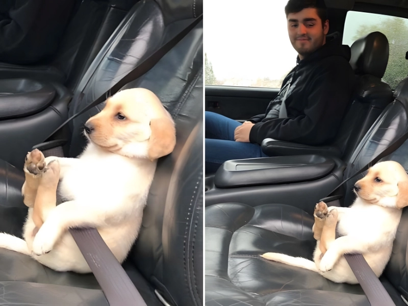 Nous aimons voir à la fois les humains et les animaux prendre la sécurité au sérieux. Ce chiot s'assoit calmement dans la voiture, ceinture attachée, prêt pour le voyage à venir.