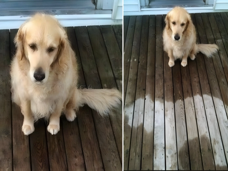 Quand il s'est réveillé, il a trouvé une tache sèche là où il était allongé. Son air perplexe est inestimable. Même avec un lit pour animaux chic, parfois le plancher est tout simplement plus confortable.
