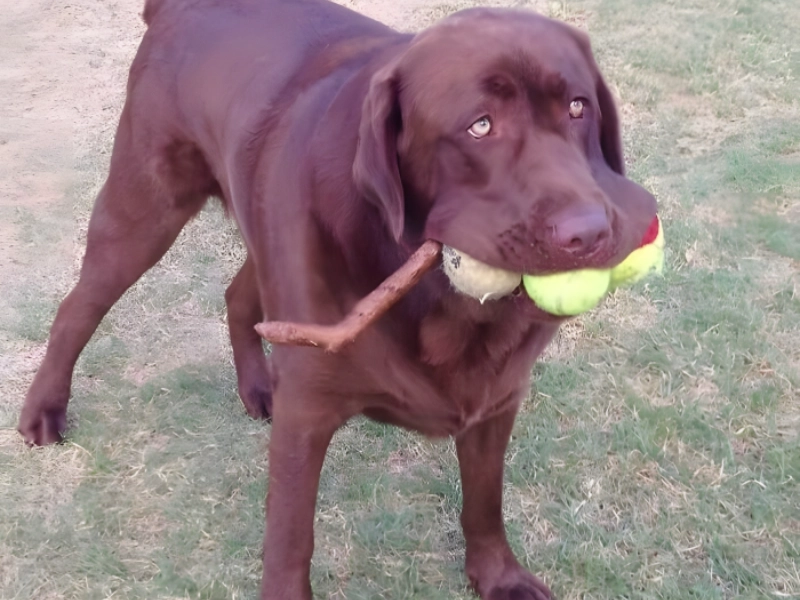 Bien qu'il ait essayé, nous ne pensons pas que ce labrador chocolat aurait pu caser quoi que ce soit d'autre dans sa gueule ; non, cette image n'est pas retouchée ! Apparemment, on avait demandé à ce drôle de cabot de rapporter les trois balles de tennis avec lesquelles il jouait. Non seulement ce brave chien a rapporté les trois balles simultanément, mais il a en plus réussi à y glisser un bâton pour faire bonne mesure — les accessoires parfaits pour tout bon toutou !