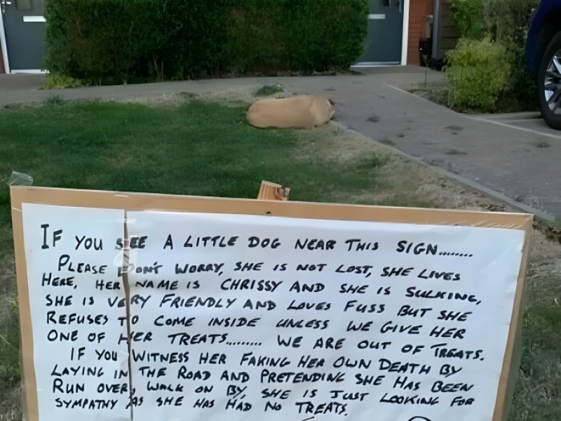 Oh, à mourir de rire ! Nous avons éclaté de rire rien qu'en lisant ce panneau ! « Si vous voyez un petit chien près de ce panneau, ne vous inquiétez pas ; elle n'est pas perdue ; elle habite ici ; elle s'appelle Chrissy ; elle est boudeuse, très sociable et adore les câlins ; malheureusement, elle refuse de rentrer à moins que nous ne lui donnions des friandises. Nous n'avons plus de friandises. Si vous la voyez simuler sa propre mort…