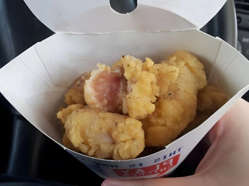 Nous aurions aimé connaître l'établissement pour pouvoir l'éviter à l'avenir. Malheureusement, un client a découvert que les tenders de poulet qu'il avait commandés – à l'extérieur apparemment croustillant et alléchant – étaient en réalité crus à l'intérieur lorsqu'il y a goûté. Le poulet insuffisamment cuit n'est pas une plaisanterie.