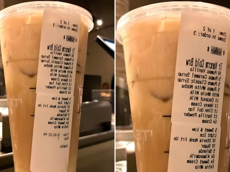 La liste comprend une autre commande étrange de Starbucks. Hannah, une cliente, semblait incapable de choisir et a fini par commander un peu de tout, au sens propre. Sur les réseaux sociaux, le malheureux employé de Starbucks qui a dû exécuter la commande a pris une photo de cette absurdité.
