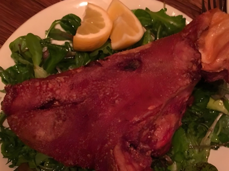 Malgré son nom peu engageant, la « face de porc croustillante » est un mets apprécié par de nombreux amateurs de porc. Une fois goûté, on oublie l'étrange appellation, car il ne s'agit pas du plat auquel on pourrait s'attendre – une véritable tête de porc frite dans l'huile bouillante sur votre assiette !