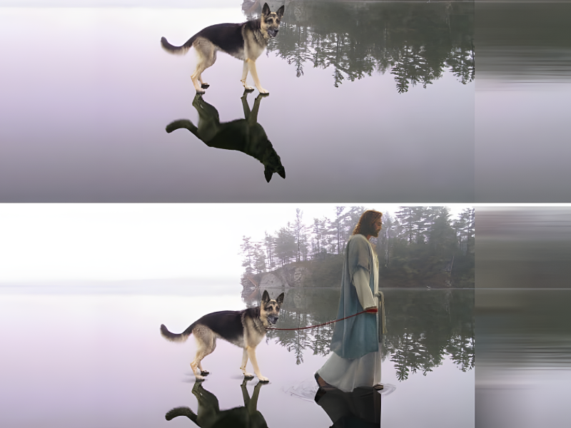 Comme nous le savons tous, les chiens ont un esprit pur et innocent. Celui qui a pris cette photo du chien marchant seul sur la glace avec Jésus et quelques "ondulations" a fait un travail fantastique. Je vous fais une standing ovation !
