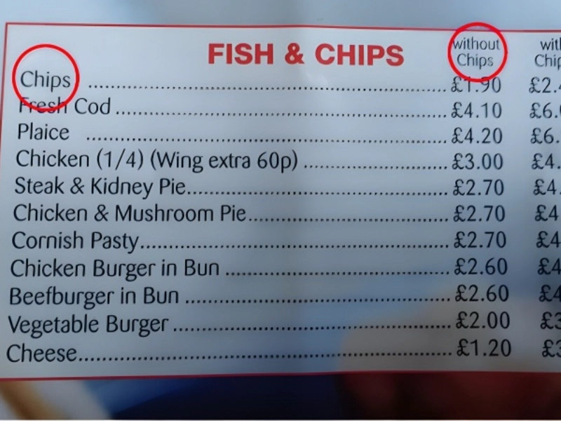 Le fish and chips est un plat populaire dans le monde entier. Mais vous êtes-vous déjà demandé si vous pouviez commander uniquement des frites, sans le poisson ? Ou alors, peut-être des frites... sans frites. Ou encore avec des frites en accompagnement. La section "chips" de ce menu graphique avec ses multiples options tarifaires est devenue un peu "fishy" (louche), quelle que soit l'information qu'elle était censée afficher. Cette incertitude peut amener les clients à s'interroger sur la nature fondamentale de leur repas. Peut-être auraient-ils dû tout simplement retirer les frites de cette section. La disposition du menu semble avoir été mal pensée, submergeant les convives. L'attention de tous se focalise instantanément sur la question douteuse des frites, au point de leur faire peut-être négliger le choix inhabituel du fromage (juste du fromage) avec ou sans accompagnement de frites. Pour toutes les mauvaises raisons, cette présentation étrange peut provoquer à la fois des rires et de l'agacement, faisant de l'expérience un souvenir mémorable. Cela nous rappelle que la création de menus destinés à attirer les clients plutôt qu'à les embrouiller dépend largement de la simplicité et de la clarté.