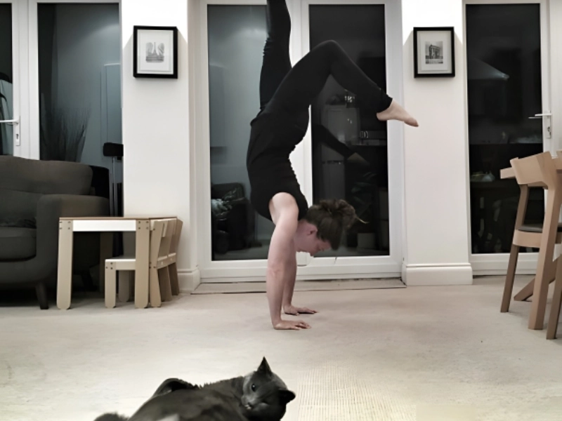 This cat is in a downward-facing pose! While the owner does yoga, the cat shows off its own moves. The human might be embarrassing the cat, who looks like it’s never done yoga before. Still, trying is what matters most. Even a lazy cat can improve with practice.