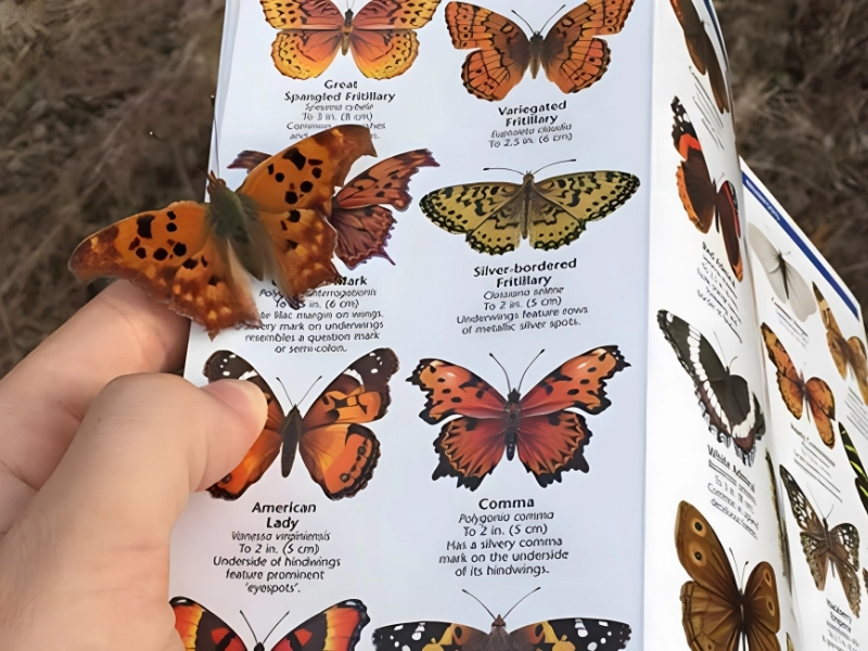 美しい「クエスチョンマーク」蝶が、誰かが読んでいるページの自種の説明部分に止まりました。もしかすると、仲間を見つけたと思ったのかもしれません。