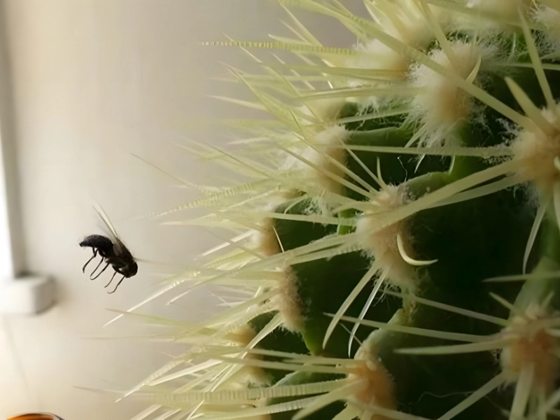 原因は不明ですが、このハエはトゲのある植物に自ら串刺しになりました。家主にとって幸いなことに、この植物は食虫植物ではありません。