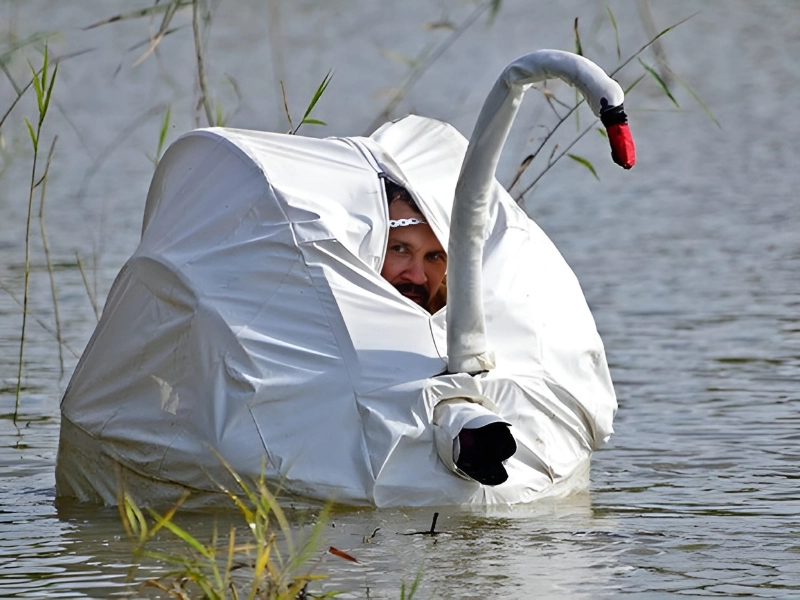 重要なのは、白鳥が彼に恋をしないことです。白い服を着て静かに浮かび、被写体は簡単に近くの優雅な鳥の一羽と間違えられる可能性があります。この気まぐれなシーンは人間と動物の境界をぼかし、そのような混同が可能な世界を想像するよう誘う、穏やかなユーモアと詩的な美しさの瞬間を作り出します。