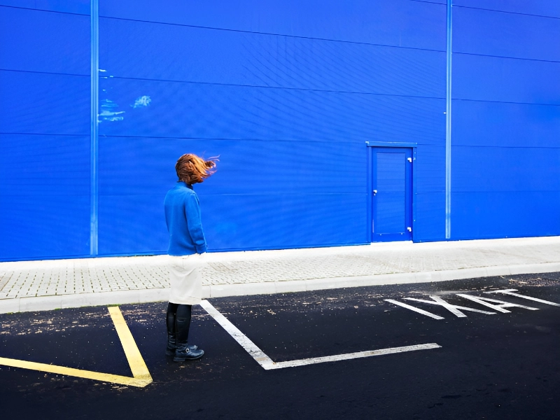 髪を青く染めるだけが残っていますが、この最後の仕上げがなくても、変容はすでに魅惑的です。被写体は鮮やかな青い背景にほとんど消え、ほぼシームレスな幻想を作り出しています。この画像は、単純な色の一致がどのように普通のシーンを遊び心のある擬態芸術の例に変え、人と環境の境界をぼかすかを完璧に示しています。
