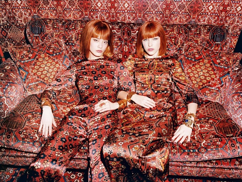 二つのドレスは余剰の布地から作られ、結果は偶然の擬態の楽しい表示です。彼らの服装が周囲のパターンを反映し、着用者はほとんど背景に消えそうです。この画像は、ファッションと環境が予期しない方法でどのように衝突し、面白くかつスタイリッシュな視覚的な調和の瞬間を作り出すかを強調します。