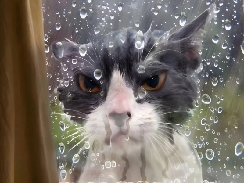 この猫は雨に濡れた後とても不機嫌そうな表情をしていますが、無理もありません。この表情から判断すると、家に帰ったら飼い主と真剣な話し合いをしたいのかもしれません。