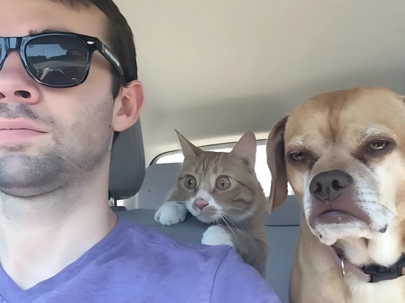 キャプションには「レッツ・ライド」とあり、アクション映画の一場面のようです。犬は集中している一方、猫は緊張しているように見えます。この小さな家族にとってドライブは真剣な事柄のようです。