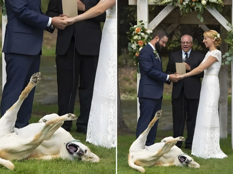 花嫁と花婿は素晴らしく見えますが、誰かが正式なイベントについての連絡を見逃したようです。この犬は結婚式の間、地面で転がりながら、完全に無頓着な様子です。