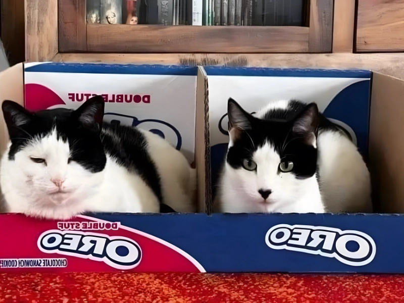 アップローダーはこのショットを捉えるために辛抱強く待ちました。オレオの箱2つ—ダブルスタッフとレギュラー—を並べると、猫たちが自然と演技を始めました。