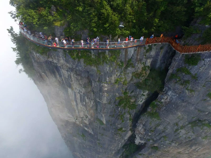 道幅は約3フィート(0.9メートル)、崖を200フィート(61メートル)にわたって伸び、海抜4,700フィート(1,430メートル)に吊るされています。透明なガラスの床は、訪問者が真下を見ることを可能にし、スリルを高めます。 強力な多層ガラスで建設され、遊歩道はその大胆な外観にもかかわらず安全性のために設計されています。スカイウォークは他の近隣のアトラクションに加わり、美しさと冒険の両方を求める人々にとって天門山を最高のスポットにしています。