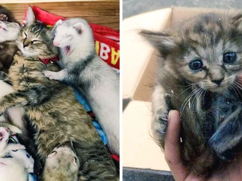 小さな迷子のコマリは、弱々しく不安そうに到着しましたが、すぐに5匹の活発なオスのフェレットの一群に包まれ、優しい好奇心を持って接されました。彼らの遊び心のあるトンネル追いかけっこや共同の昼寝は、彼女の社会的な学校となりました。自分をイタチ科の兄弟の一員だと思い込み、彼女は彼らのふざけた様子を真似た後、独特の猫らしい優雅さでそれらを融合させました。今でも、成長して自信を持った彼女は、午後の昼寝に彼らの温かい集まりを求めることがあり、家族は生物学ではなく愛情によって形成され得ることを証明しています。