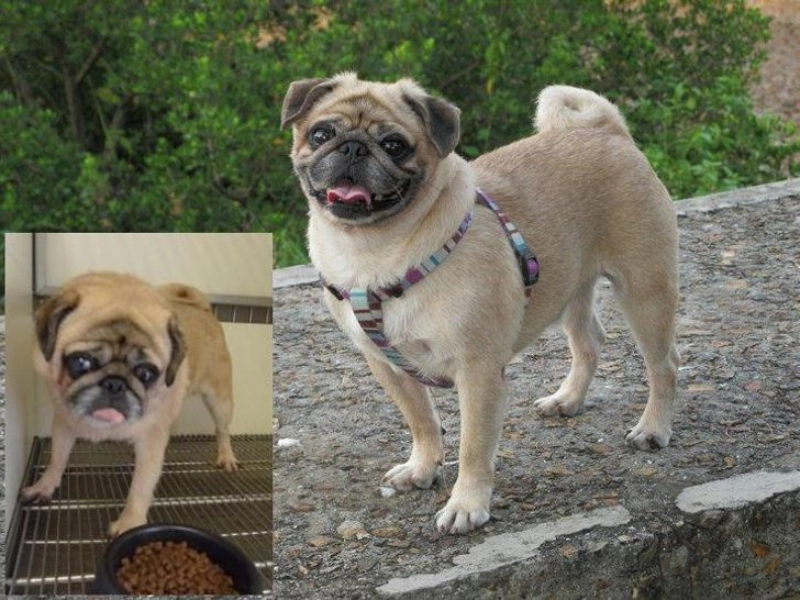 パッチーズの初期の写真は、まだ適応中のパグを示しており、目は少し不安そうでした。後の写真では、自信に満ちた伴侶が安堵感を放ち、体重は安定し、表情は柔らかです。誇らしげにオンラインで共有されたこの対比は、忍耐、体系的なケア、そして愛情が、残されたペットから家族の中心メンバーへとアイデンティティを再構築できるという静かな証拠を提供します。